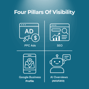 Same keyword. Four different placements. Four powerful strategies. You’ve got the blueprint: SEO to build website trust, Google Business Profile to own your neighborhood, PPC to strategically expand your reach, and the latest updates with AEO and GEO to stay one step ahead of your competition for AI-powered searches.